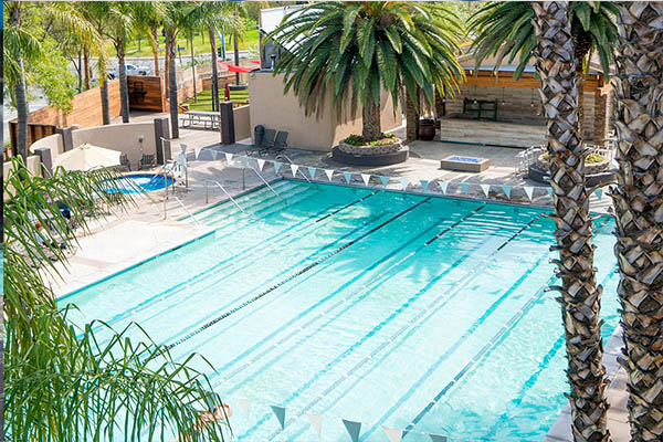 SAN JOSE: features a heated outdoor, 6-lane Junior Olympic pool & hot tub surrounded by towering palm trees and beautiful California skies. Reserve your own swim lane or book an Aqua Fitness, Aqua Zumba® or Master Swim class with our expert swim instructors to prepare for swim meets, triathlons, and open water swims.